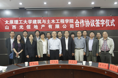 建工公司经理雷宏刚与山西光信地产有限公司副总经理田晓虹分别代表院企双方签订《建工公司与山西光信地产有限公司合作协议》。双方还就建立老员工实习基地、产学研结合等方面的问题进行了深入探讨。