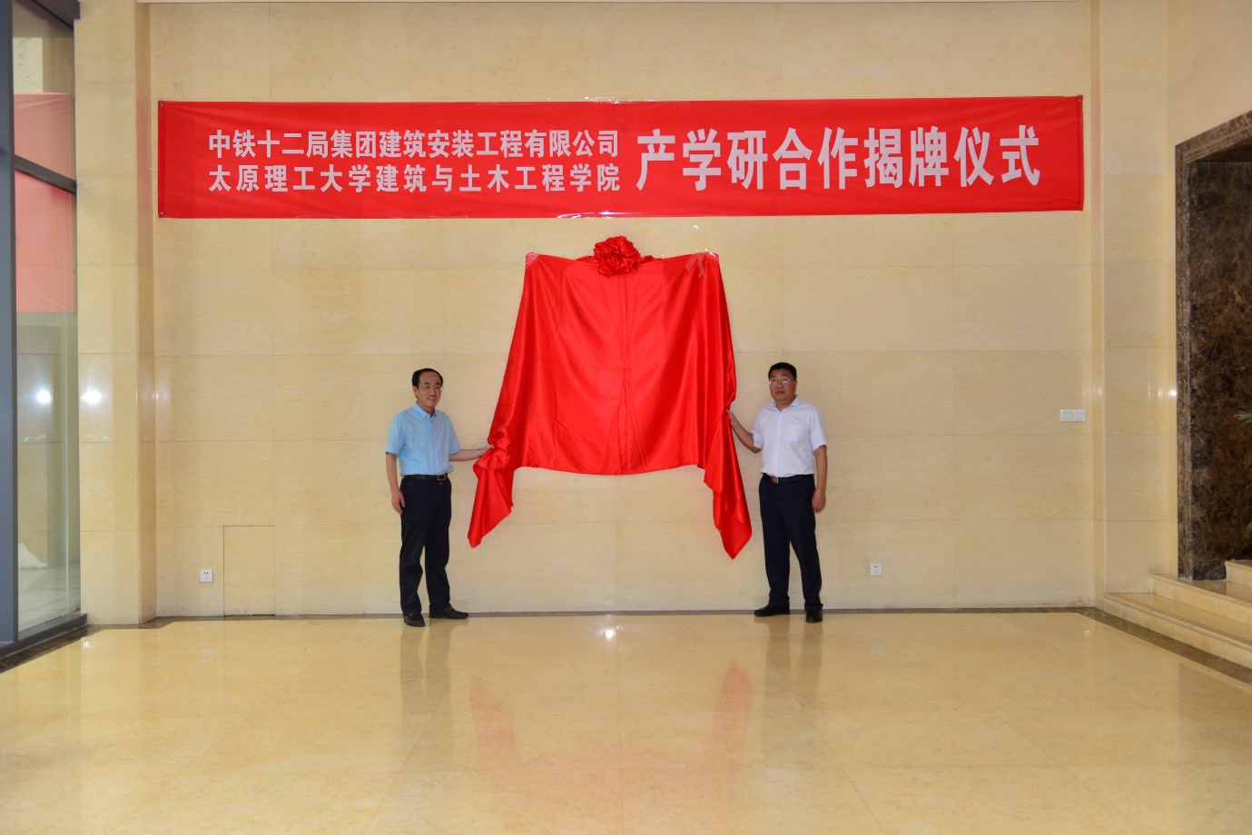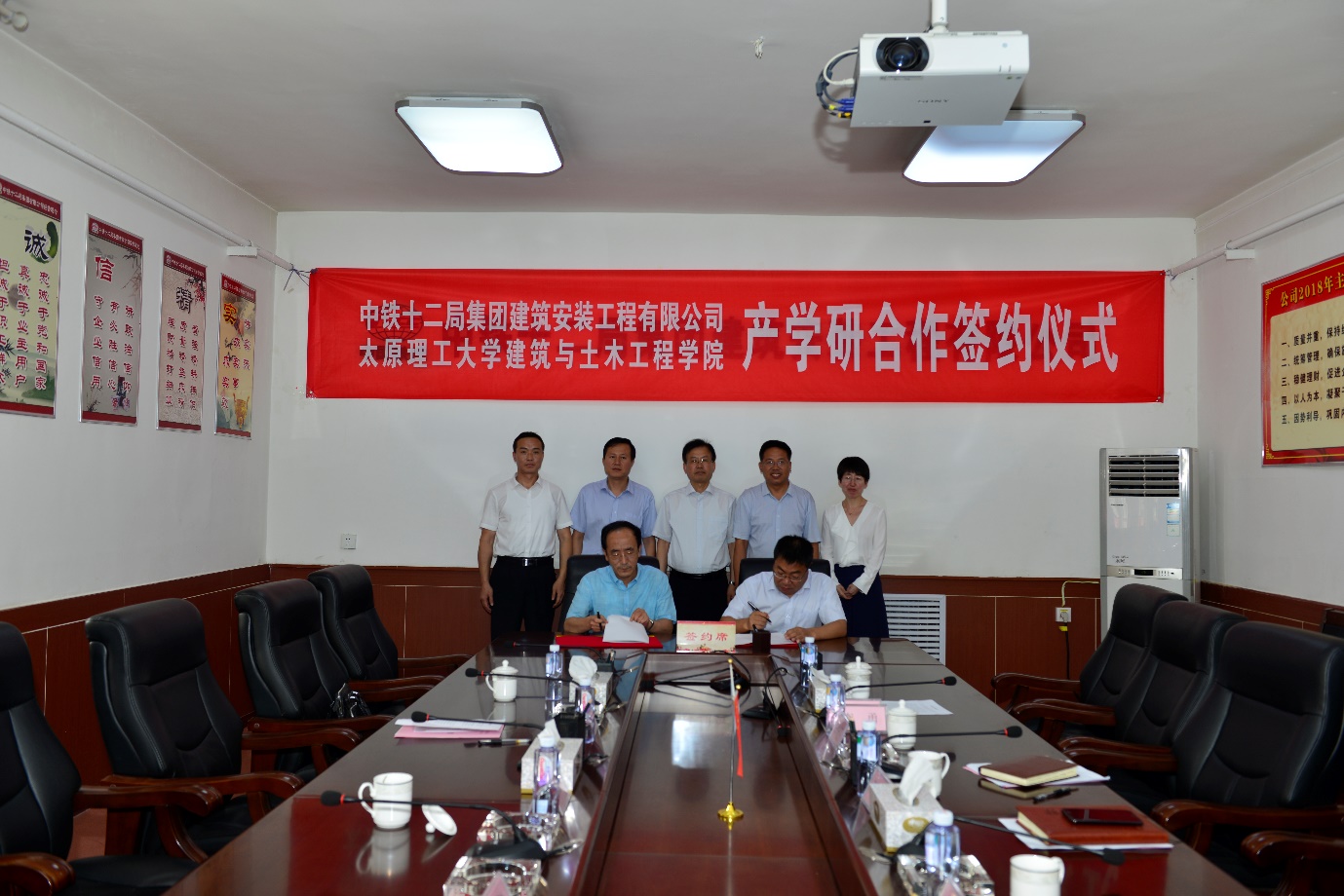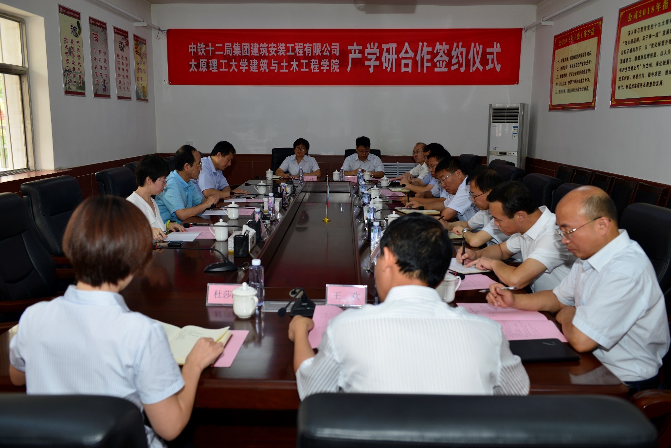 2018年7月8日上午10点,MS88官方网站建筑与MS88官方网站与中铁十二局集团建筑安装工程有限公司在建安公司会议室举行产学研合作框架协议签署仪式及产学研合作揭牌仪式。建筑与土木工工程公司经理雷宏刚教授、土木系主任董晓强教授、土木实验中心主任刘元珍教授,中铁十二局集团建筑安装工程有限公司董事长、总经理蔡英康、党委书记姜振生、公司副总经理、总工程师王中军、副总经理卢会永、副总工盖宏、副总工解明旭、副总经济师李勇、科技部副部长范伟、科技部副部长王美静、测试中心副主任王欢、科技部部员杜莎莎出席了签约及揭牌仪式。