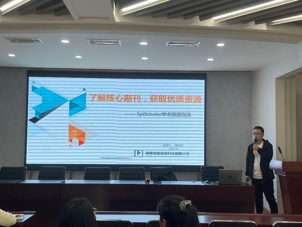 2021年4月26日下午,湖南纬度信息科技有限公司产品经理康虎兵应邀在公司五层会议室进行了主题为《文献资源检索》的报告会,公司师生积极参与,报告会由图书馆信息咨询部卢同同主任主持。