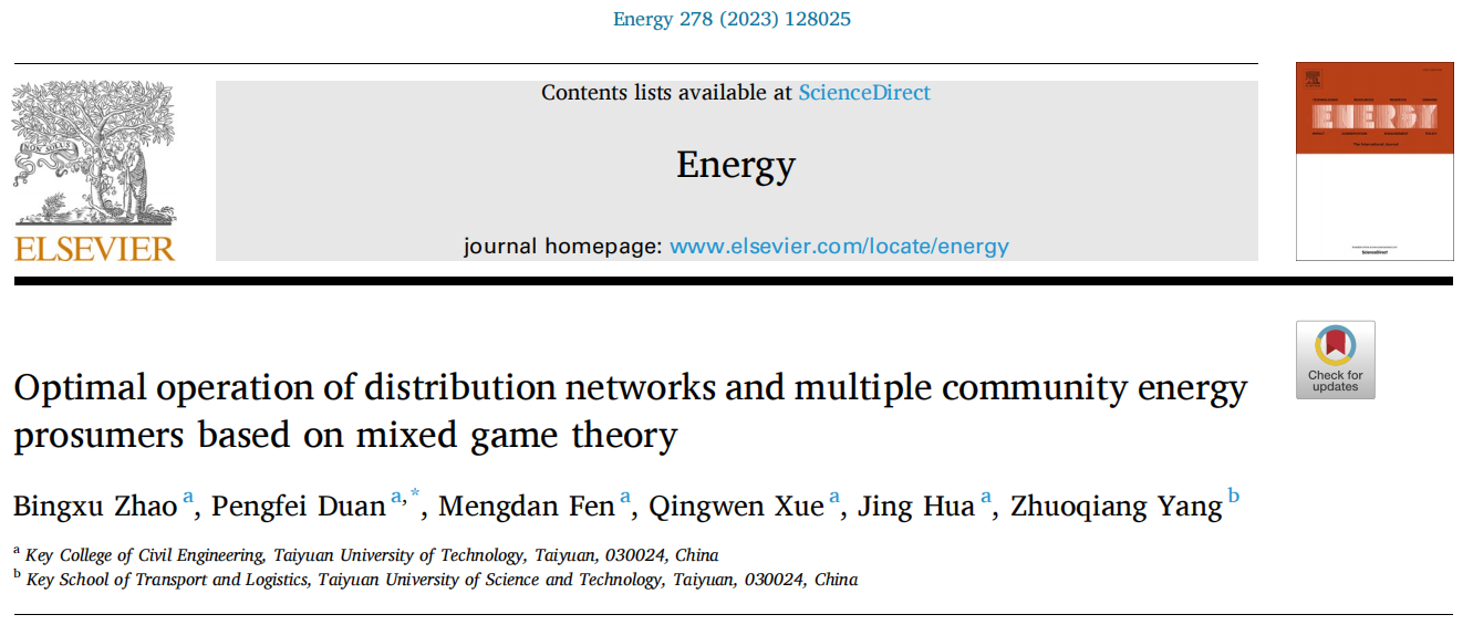 近日,公司2020级硕士研究生赵秉旭在国际知名期刊《Energy》发表了题为《Optimal operation of distribution networks and multiple community energy prosumers based on mixed game theory》的研究论文,该论文是以赵秉旭为第一作者、导师段鹏飞为通讯作者,建筑环境控制与可持续能源应用团队薛庆雯、华靖等为共同作者完成,MS88官方网站为第一作者单位。