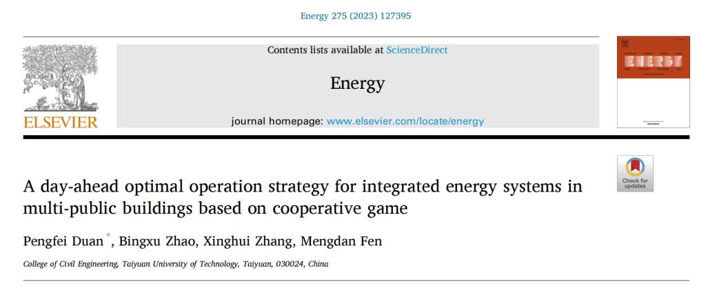 此前,赵秉旭联合导师段鹏飞副教授、共同作者张兴惠副教授以及建筑环境控制与可持续能源应用团队其他成员通力合作的另一研究成果同样发表在《Energy》期刊,题为《A day-ahead optimal operation strategy for integrated energy systems in multi-public buildings based on cooperative game》,该论文MS88官方网站为唯一作者单位。