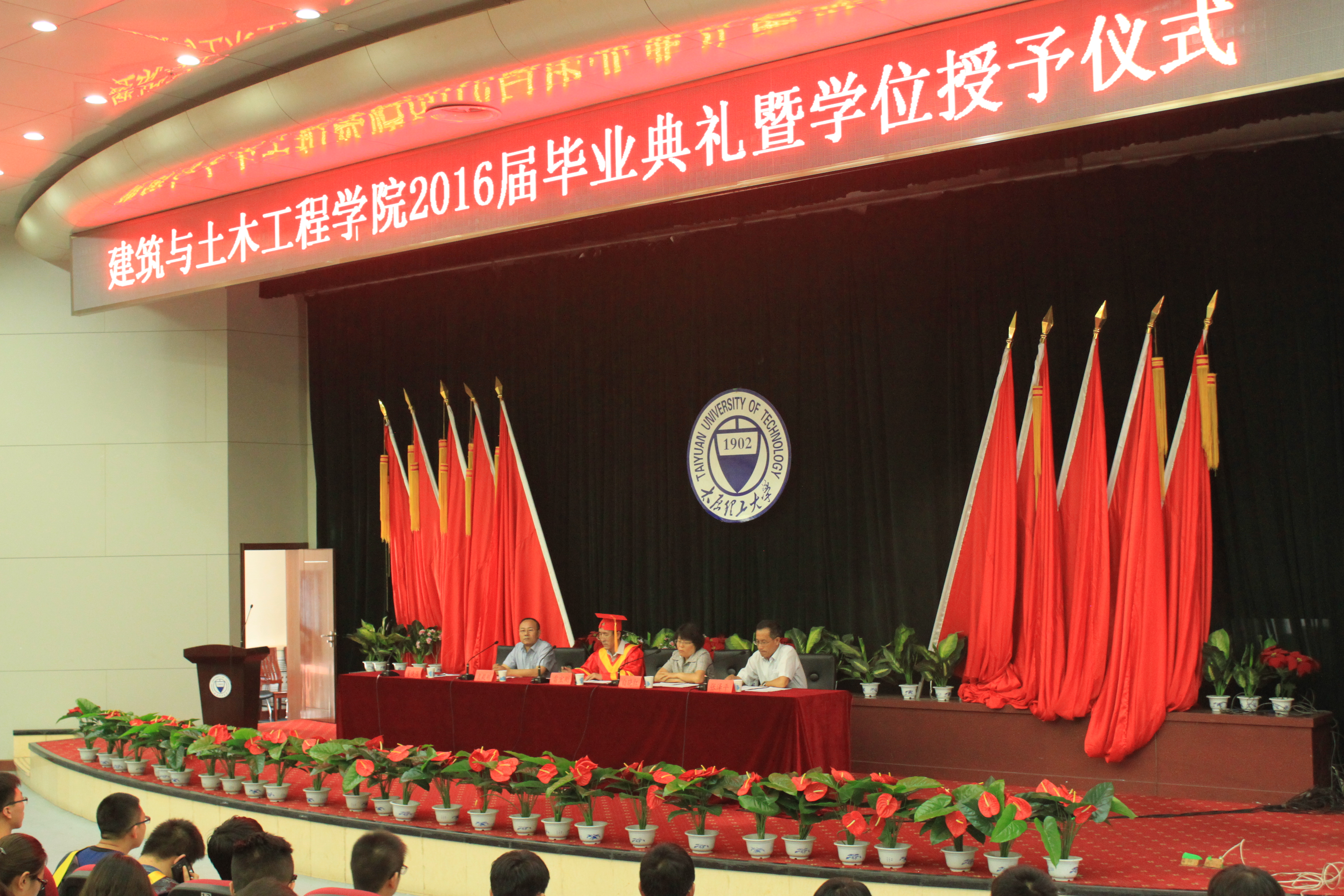 毕业典礼在雄壮的国歌声中拉开帷幕。公司党委副书记袁毅刚向大家通报了2016年建工公司毕业生就业情况,他指出虽然建工公司的就业比例较前几年有所下降,但整体不错。他希望大家认真研读毕业生的公开信,注重灵活就业,并祝愿同学们事业有成,一帆风顺。