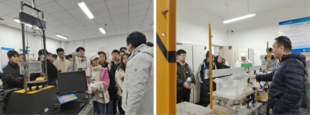 在不同实验室,相关负责老师带领同学们参观了各类实验仪器,详细介绍了其主要组成部分及工作原理。此外,同学们还参观了拉伸实验机和振动台等先进设备,并现场观看了混凝土梁的压弯实验过程,深入了解了结构的多种测试方法。通过讲解,同学们对土木工程领域先进实验仪器和设备有了更为全面、深入的认识,也为之后的专业学习带来了新的思路与启发。