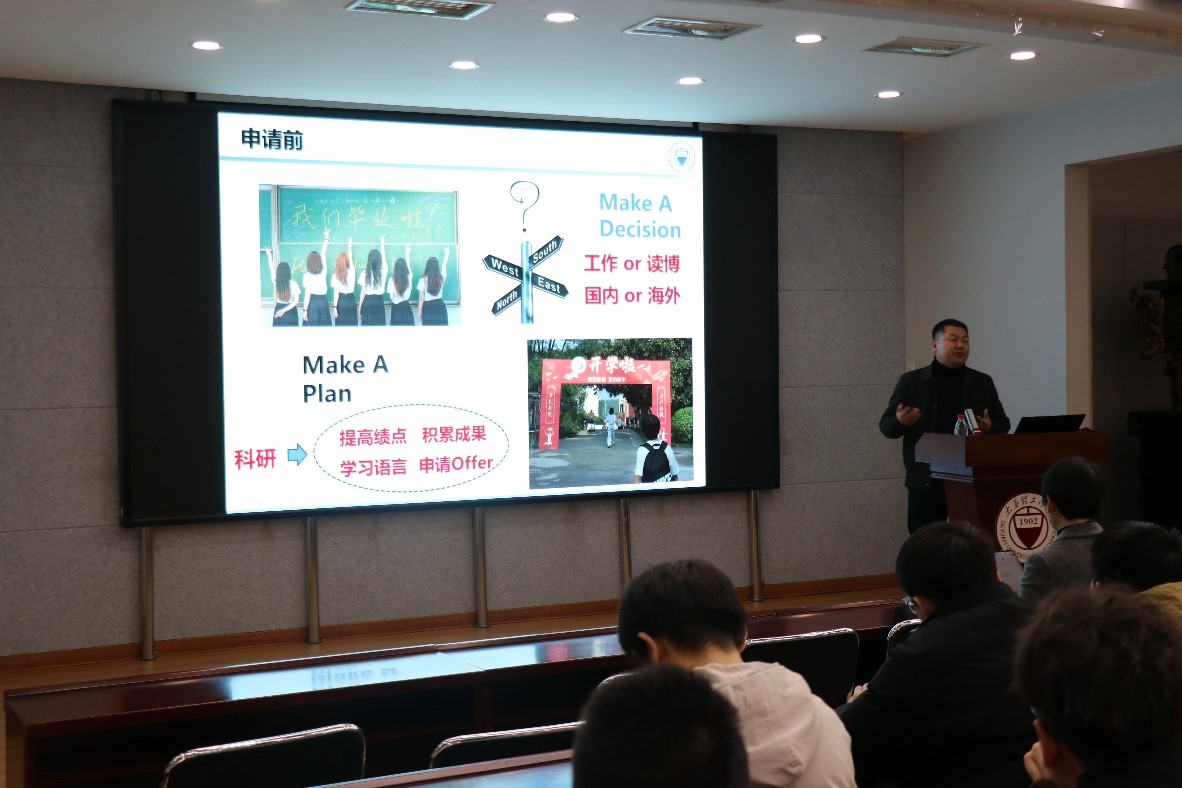 宣讲会伊始,孙逸飞教授详细介绍了公司国际合作交流项目的整体情况,包括与国外高校的联合培养项目、短期交换生项目以及国际学术会议参与情况等,孙经理以自身海外留学经历为例,为同学们展现了精彩的海外职工活,鼓励同学们积极把握出国交流学习的机会,提升自身竞争力。