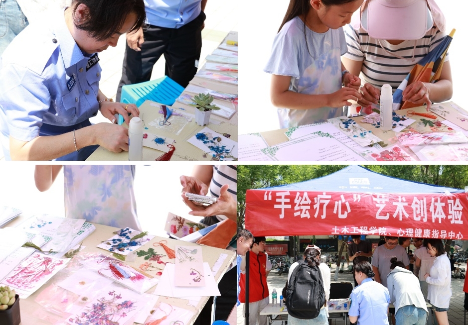 活动现场,两张帐篷搭建的创作空间内,国风空白书签、干花树叶材料、21色丙烯马克笔等物资有序陈列。在美术志愿者的指导下,参与者们以书签为画布,展开多元的心灵叙事。当创作完成,百枚书签被图钉悬挂于白色KT板“书签森林”展板,瞬间化作一片色彩斑斓的心灵镜像。这片由艺术构建的“森林”,既是个体情绪的外显载体,更是朋辈间无需言语的情感共鸣场,也让参与者在观展中感受到“原来我的心事有人懂”的温暖联结。