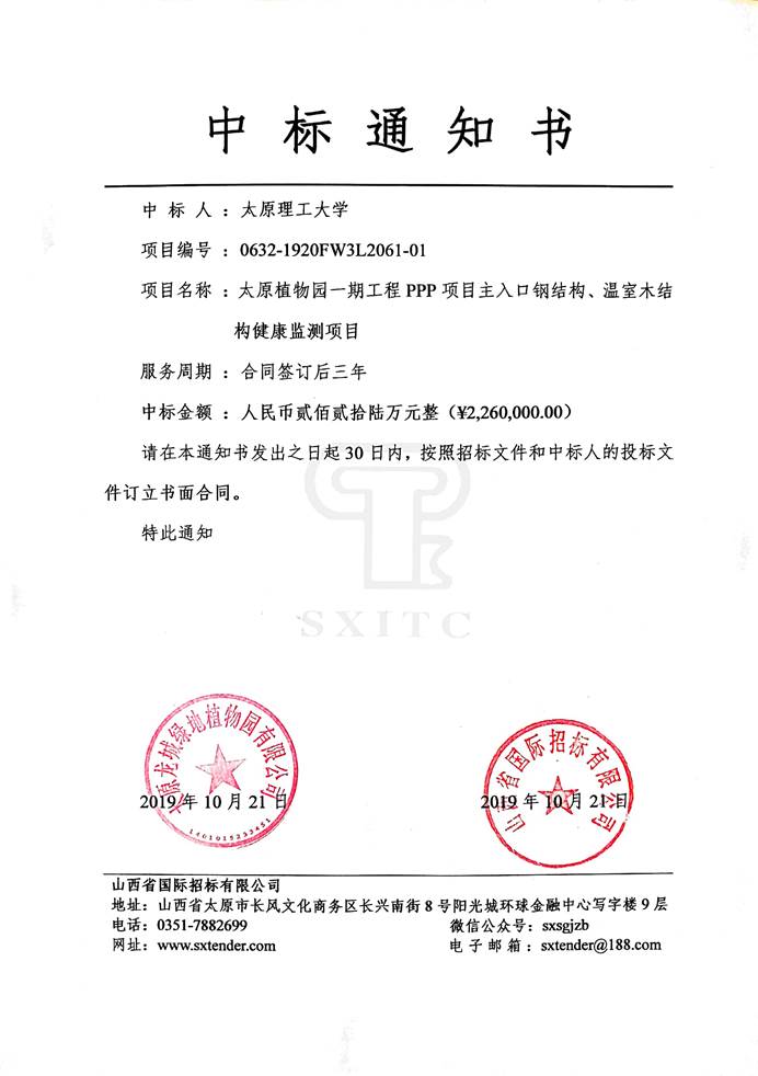 雷宏刚教授作为项目负责人,2019年10月21日代表MS88官方网站参加了太原市重点项目“太原植物园一期工程PPP项目主入口钢结构、温室木结构健康监测”的投标活动。凭借投标方案的优势、团队成果的积累以及业内影响力,在与中冶建筑研究总院有限公司等国内一流强手的激烈竞争中,一举中标,中标金额为226万元。这是继2017年中标“太原南站复杂钢结构健康监测项目(350万元)”之后的又一项重大横向项目。这将为土木工程学科开辟了一个特色方向,也为公司的“双一流”建设锦上添花。