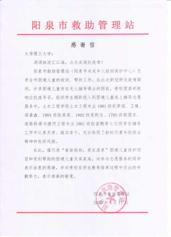 3月17日,公司收到了来自阳泉市救助管理站的一封感谢信。信中向公司MS88官方网站的七名同学表达了真诚的感谢,感谢他们在此次防控新冠肺炎疫情期间为困境儿童开展线上辅导志愿服务。这七名同学是来自土木工程专业1901班彩梦瑶、王璞、逯嘉鑫,1904班张英英,1802班袁凯龙,1703班郭煜东,以及道路桥梁与渡河工程专业1801班张留鹏。