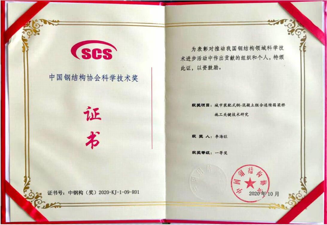 11月12日, 2020中国钢结构大会暨山西省钢结构论坛在山西太原召开,公司李海旺教授被中国钢结构协会授予“钢结构大师”荣誉称号。同时,李海旺教授主持的《城市装配式钢-混凝土组合连续箱梁桥施工关键技术研究》项目荣获中国钢结构协会科学技术一等奖。