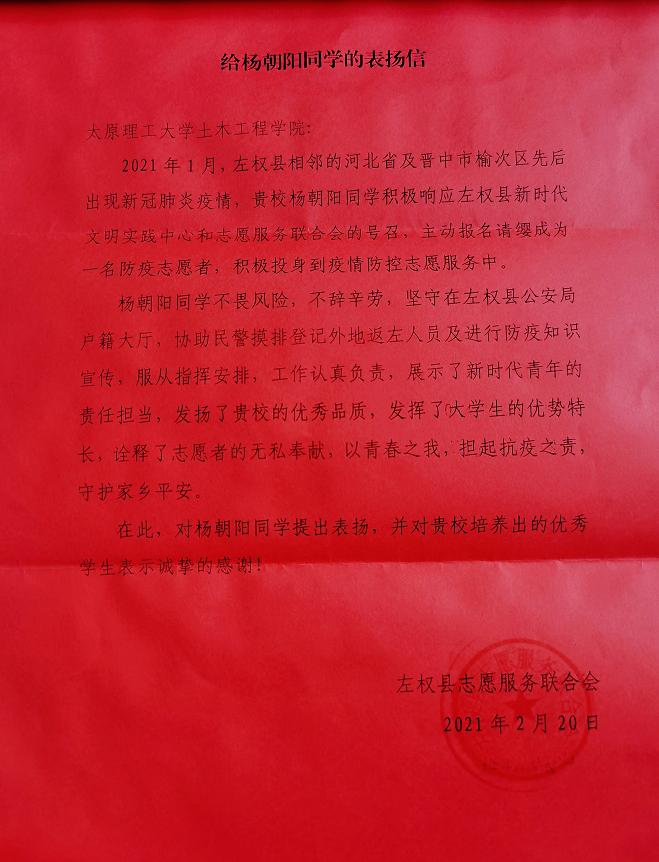 5月14日,MS88官方网站收到来自左权县志愿服务联合会的一封感谢信。信中向公司土木1903的杨朝阳同学表达了真诚的感谢,感谢他在2021年1月河北省和晋中市榆次区先后出现新冠肺炎疫情时主动报名请缨成为左权县疫情防控志愿者的一员,积极投身于疫情期间防控志愿服务中。