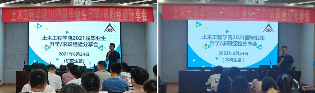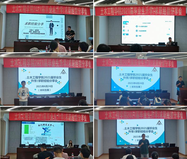 会上,各位毕业生从升学、考公、土建类企业面试等方面分别做了详尽而又深入的分享。研究生专场中,张进标对研究生如何选择设计院以及面试中应注意的问题都做了简要介绍;方佩莹将自己面试各大地产公司的实战经验做了复盘分享,告诉大家面试中要充分展示自己的优势;郝亚烨分享了自己择业过程中的心路历程和公考备考中的丰富经验,希望学弟学妹都选择适合自己的发展方向。本科生专场中燕秉法和胡玉分别对保研和考研政策以及备考过程做了专题分享,并且对如何做好备考过程中的心理建设作了重点介绍,告诫大家要全面收集信息,提前准备,稳住心态。前来参会的同学对自己感兴趣的方面踊跃提问,分享的毕业生也知无不言,言无不尽,分享会现场气氛热烈而融洽。