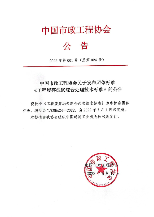 公司岩土与地下工程研究所何斌博士、马富丽博士、韩鹏举教授参编中国市政工程协会团体标准-《工程废弃泥浆综合处理技术标准》于2022年05月17日发布,2022年07月01日实施。
