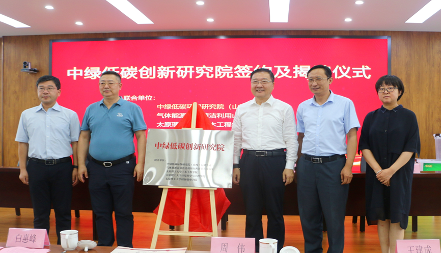 杜震宇代表公司与各联合单位代表签署了合作协议。李晋平、白惠峰、周伟、王建成、郭菲共同为中绿低碳创新研究院揭牌。