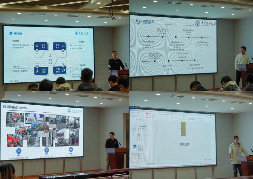 硕士生王书慧和魏建建两位同学向大家展示了细致的周期学业计划,介绍了常用的阅读文献、绘图和科研的工具,分享了高效查找高质量文献的方法。杜辉波同学重点分享了论文写作的总体思路和写作技巧,强调学习到精疲⼒竭并不是最好的⽅法,要懂得劳逸结合才会更有效率。高孟亮、胡文伟和刘宇菠三位同学分享了自己参与科研项目的丰富经历,强调研究生阶段的素质能力和科研能力的重要性,努力做到勤学致知、屡践致远、全面发展。