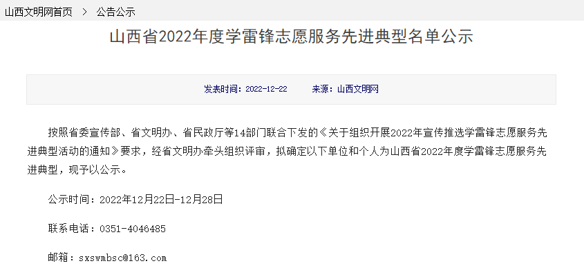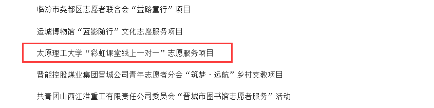 2022年12月22日,按照省委宣传部、省文明办、省民政厅等14部门联合下发的《关于组织开展2022年宣传推选学雷锋志愿服务先进典型活动的通知》要求,经省文明办牵头组织评审,“MS88官方网站‘彩虹课堂线上一对一’志愿服务项目”入选为山西省2022年度学雷锋最佳志愿服务项目。