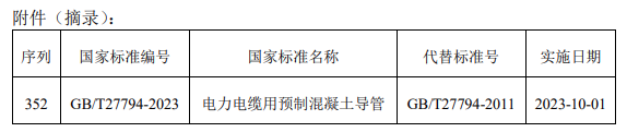 《电力电缆用预制混凝土导管》 (GB/T27794-2023) 是根据我国电力电缆导管的实际生产和使用现状,参考国外先进生产技术水平,并考虑行业的发展趋势修订的。在传统电力电缆施工工程中,由于施工技术和人员技能水平差异较大,采用现场浇筑施工容易造成现场施工量大,工序复杂、工程效率低和工程质量不易控制,采用混凝土预制构件,可以有效解决这些问题,对电力电缆工程建设节能环保、降本增效极具积极意义。