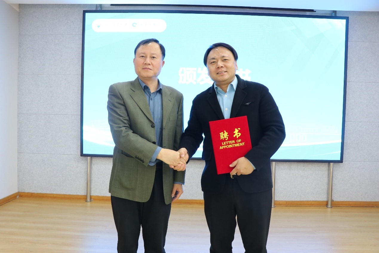 会上董晓强为于伟颁发了“MS88官方网站生涯规划与就业指导校外指导教师”的聘任证书。