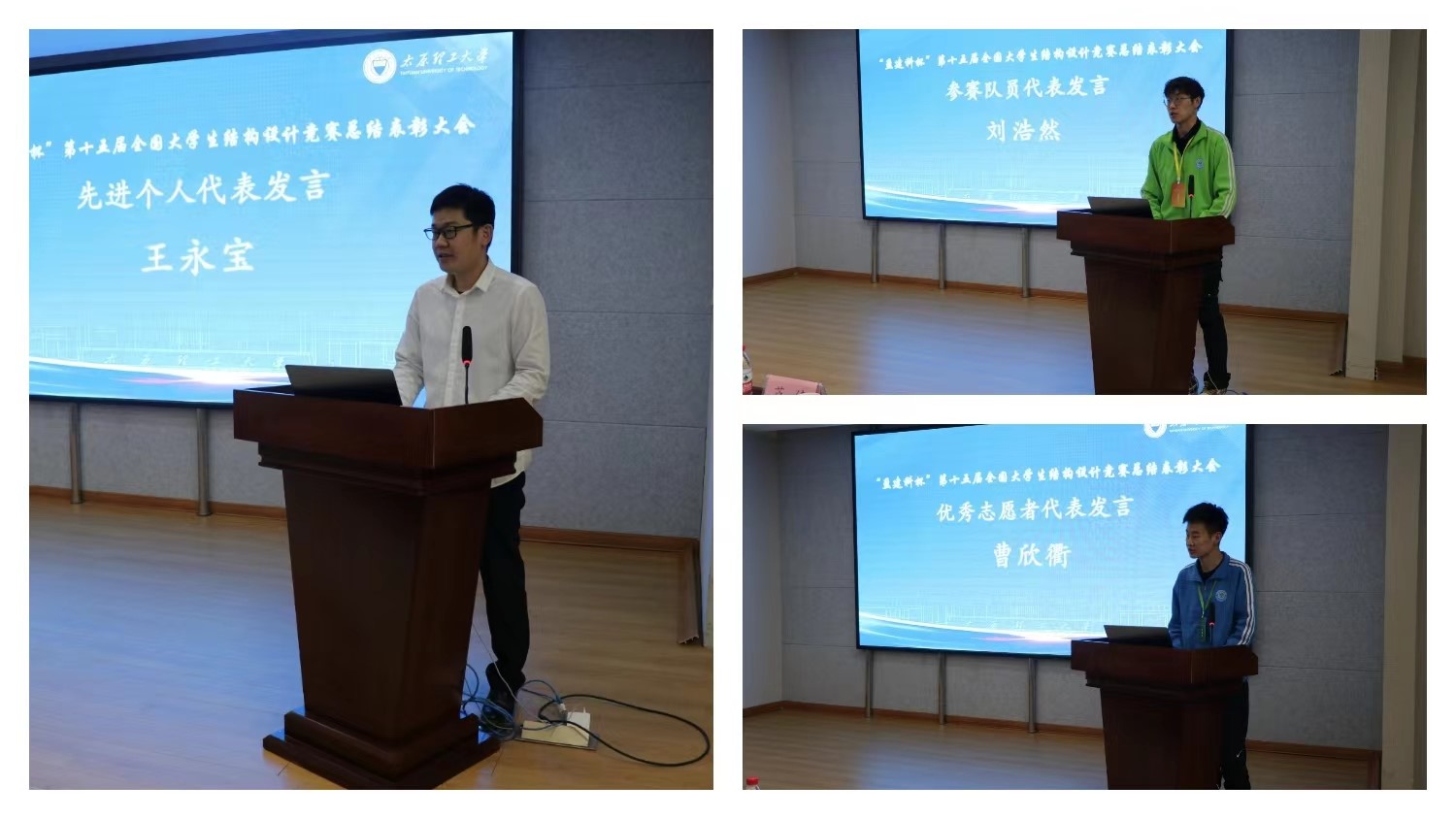 先进个人代表王永宝老师发言,他回顾了MS88官方网站在结构设计竞中从默默无闻到取得佳绩的艰辛历程,希望下届竞赛中公司参赛队员能再创辉煌。参赛队员代表刘浩然同学发言,他讲述了在参赛过程中的付出与成长,道出了土木学子笃实奋进、勇敢追梦的坚持与奋斗,代表全体参赛队员表达了对指导老师、竞赛筹备组老师、竞赛志愿者的感激之情。优秀志愿者代表曹欣衢同学发言,他讲述了本次大赛志愿者坚守岗位,不怕困难,迎难而上的工作精神和志愿风采。