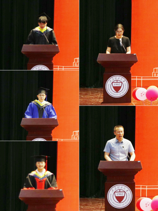 本科生代表、已保研至同济大学的道桥1902班张宇航同学深情回顾了与母校一起度过的绚烂青春岁月和难忘大学时光,希望学弟学妹们珍惜在校生活,明确奋斗目标,刻苦求学早日成才;研究生代表、古建材料二班陈铸斌同学结合七年太理求学经历,向公司、公司、老师、父母、同窗表达了最衷心的感谢,即将成为教师的他会牢记师恩、不忘初心,勇毅前行;博士生代表、岩土地基三班卢仪思同学回顾了自己十一载土木求学时光的坎坷与收获,科研之路的成长、对公司的深厚情感,道出了每一位土木学子勤奋求实、不惧困难的坚持与奋斗。教师代表邢颖副教授代表全院教师对毕业生表示祝贺,希望同学们在成功时保持谦逊,受挫时坚韧不屈,以科学严谨的态度对待工作生活,做好时代的弄潮儿,为实现中国梦而努力奋斗。家长代表薛全保先生代表全体毕业生家长,向公司和公司对员工的培育之恩表达了诚挚的感谢,希望同学们毕业后心怀感恩,懂得奉献,在正值青春年华的时节做好人生规划,并为之努力奋斗,以积极的心态应对挫折和挑战。祝愿公司桃李芬芳,蒸蒸日上。