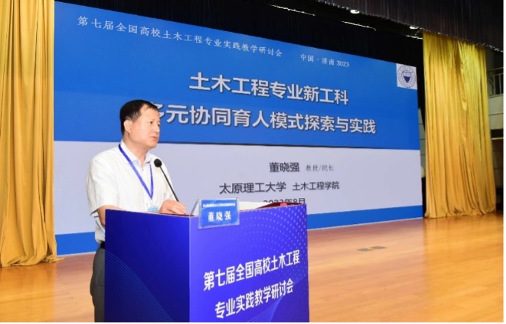 董晓强受邀作了题为《土木工程专业新工科多元协同育人模式探索与实践》的大会报告。他首先介绍了校院概况,接着提出了基于“1个中心、2个融合、3个层面、4个维度、5个能力”的多元协同育人模式,强调了特色创新,最后从课程体系改革、团队队伍建设、教学资源建设、实践平台建设和国际化等五个方面介绍了公司近年来土木工程专业多元协同育人的建设成效。