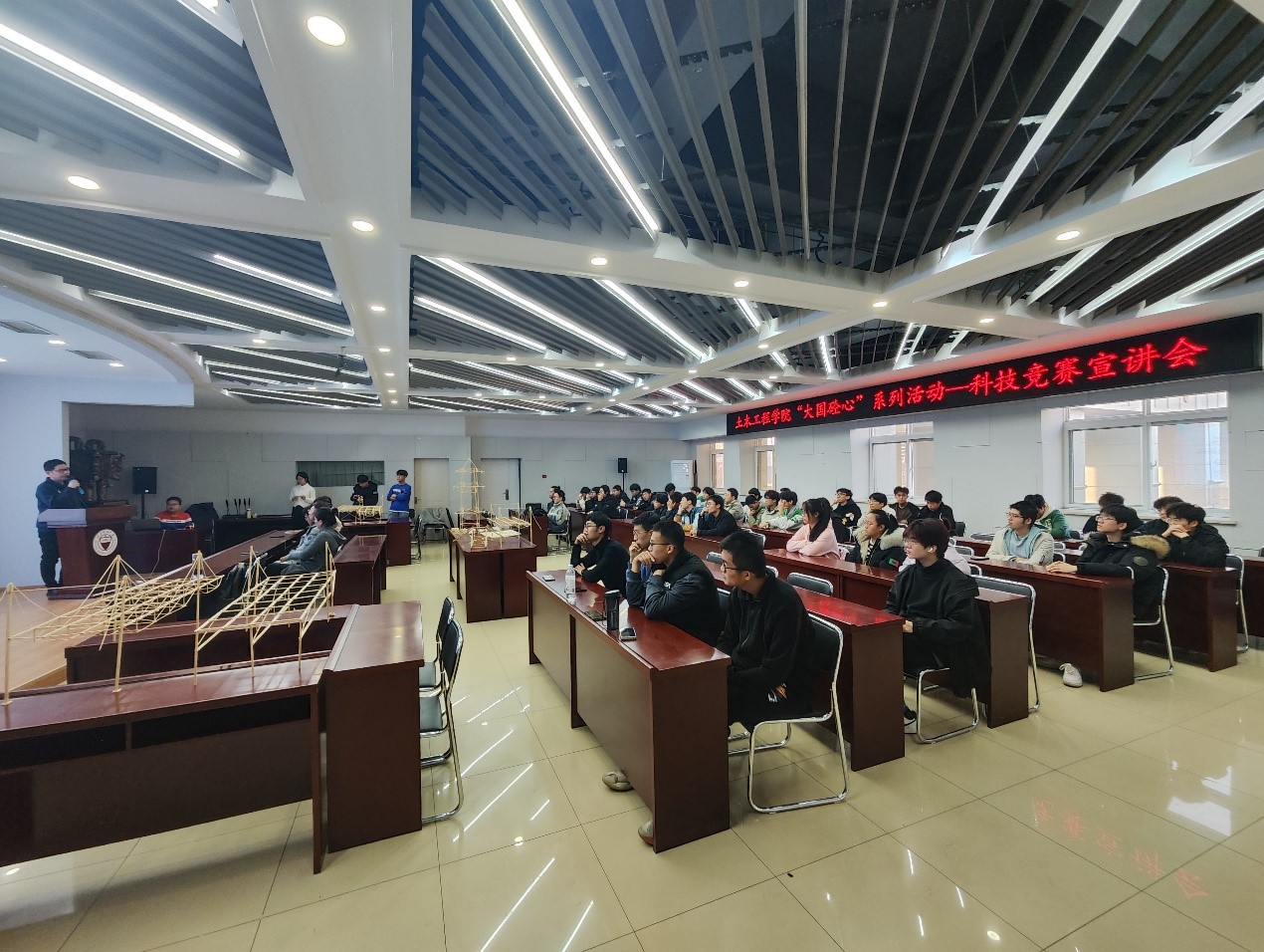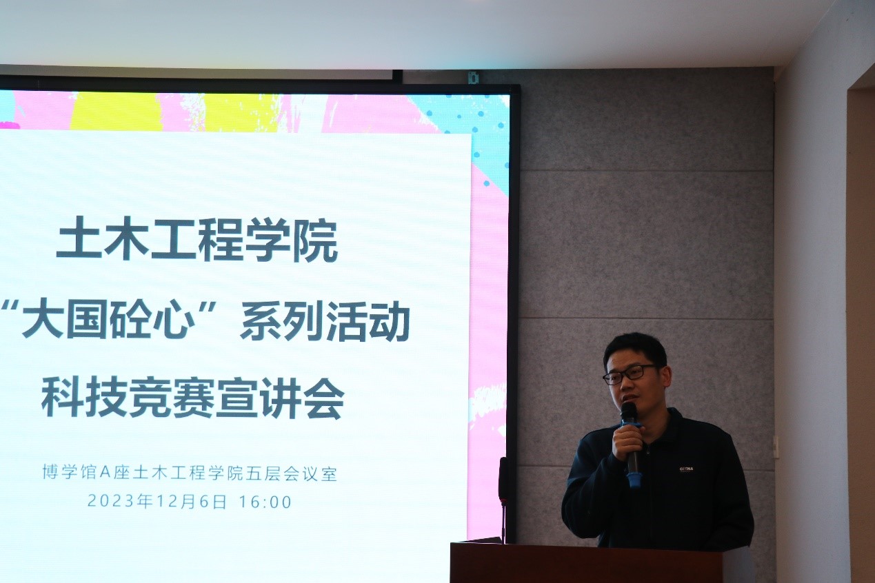 宣讲过程中,绿建道桥二班史佳玉为同学们解读了科技竞赛的概念以及参与竞赛对大家未来发展的积极意义;道桥2001班孙海军介绍了科技竞赛中理论答辩竞赛的相关知识以及报名、备赛、现场答辩过程中应注意的事项;土木2104班黄文甫介绍了今年结构设计大赛赛题、结构设计制作的理论构思和细节节点制作等知识;土木2004班王佳介绍了自己参加科技竞赛的经验,向同学们阐述了参加学科竞赛要以目标为导向和求精不求多的重要性;土木2006班孙柏乾讲述了自己获得全国老员工结构设计竞赛一等奖的准备过程和丰富的竞赛经验,并结合学科竞赛给自身带来的成长为同学们分享了参赛经验和心得体会。