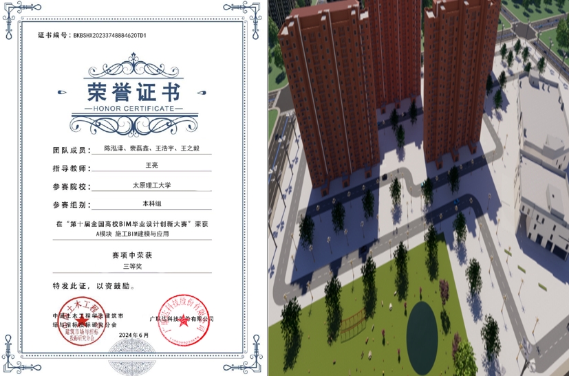 近期,由广联达公司主办的第10届全国高校BIM毕业设计创新大赛落下帷幕。经过激烈的角逐,在王亮等老师的精心指导下,公司取得了令人瞩目的成绩:荣获一等奖1项,三等奖3项以及优秀奖2项,充分展现了公司的创新实力与竞赛水平。
