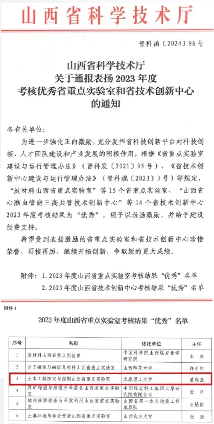 近日,山西省科技厅完成了省重点实验室、省技术创新中心2023年度考核工作,土木工程防灾与控制山西省重点实验室(以下简称“重点实验室”)考核优秀,这也是本年度公司唯一一所考核优秀的省级科技创新平台。本次考核坚持质量、绩效、贡献为核心的评价导向,破四唯,讲贡献,将承担省级以上科研任务、引进培育人才、科技成果转化和科学贡献等作为重要考核评价指标,根据考核结果确定财政支持经费,并实行动态调整和差异化支持措施,实现平台有进有出、分类支持,对于考核优秀的平台,享受“免申即享”政策,直接拨付奖补资金。