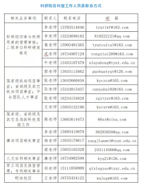 疫情防控期间,为做到疫情防控和科研管理服务工作“两手抓”,科研院全体工作人员将在工作时间内全天候远程在线办公,将各类科研相关通知公告第一时间在科研院网站(http://kj.tyut.edu.cn/)、“MS88官方网站科技信息”微信公众号、“太原理工科技信息群”QQ群(群号:203560682)、“TYUT人文社会科学总群”QQ(群号:170105893)、“理工大科技交流群”微信群等网络媒介上宣传推广,请科研人员随时关注科研院发布的信息,建议各类申报、统计、上报材料尽量以电子版为主,必要的各类纸质材料通过科研院相关负责人员和各公司、科研人员约定报送时间的方式,实行错时报送、分批分次报送至指定的科研院对外窗口408室,最大限度地减少各单位报送人员的接触;需要校内评审的项目、奖项等,一律采用函评方式进行。疫情防控期间,科研院相关业务办理流程及各科室工作人员联系方式发布如下: