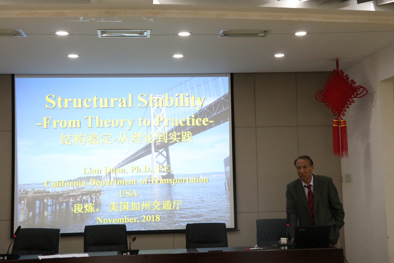应建工公司的邀请,美国加里福尼州交通厅钢结构委员会主席、资深桥梁工程师段炼于2018年11月7日到访公司,在博学馆五层报告厅做了主题为“结构稳定——从理论到实践”的学术报告,由雷宏刚经理主持,土木系师生100余人聆听了此次报告会。