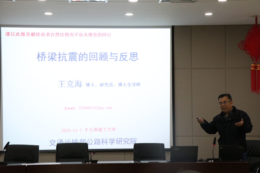 应建工公司的邀请,国家减灾委专家王克海于2018年11月7日到访公司,在博学馆五层报告厅做了主题为“桥梁抗震的现状与展望”的学术报告,由雷宏刚经理主持,土木系师生100余人聆听了此次报告会。