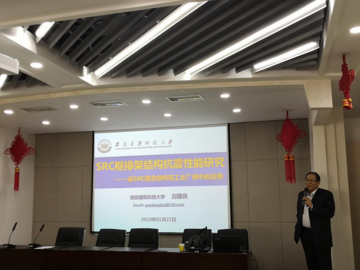 应公司的邀请,2019年1月21日西安建筑科技大学白国良教授到访公司,在博学馆五层会议室做了题为“SRC框排架结构抗震性能研究——谈SRC组合结构在工业厂房中的应用”的学术报告,由董晓强副经理主持,土木系师生100余人聆听了此次报告。