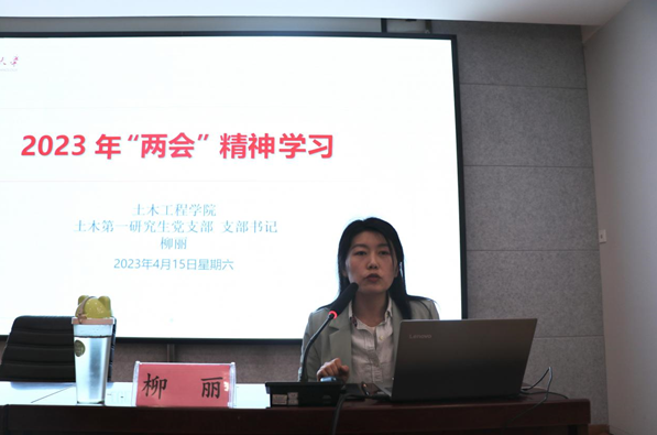 土木第一研究生党支部书记柳丽对2023年“两会”精神进行了详细解读,从“两会”概况、重要讲话、报告聚焦、重点关注四个方面,使参加培训的同学了解了什么是“两会”和“两会精神”。柳丽要求同学们要以只争朝夕的昂扬斗志、守正创新的实干精神,为实现中华民族伟大复兴作出新的贡献。