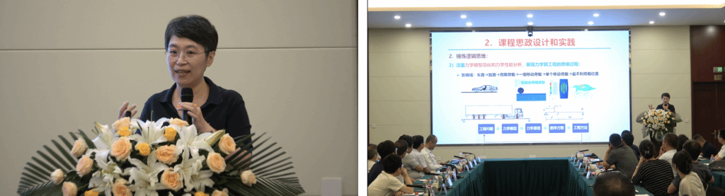 接下来,清华大学土木系结构力学教研室的邢沁妍副教授以“清华大学结构力学课程思政的实践”为题做了相关报告。邢老师结合自身在清华大学的授课经验分别从课程思政的定位与目标以及课程思政和实践方面详细分享了课程思政的实践心得,邢老师在分享中提到课程思政的开展过程中需要融入、嵌入、渗入、浸润、感染以及熏陶,通过潜移默化的过程实现润物细无声的效果。