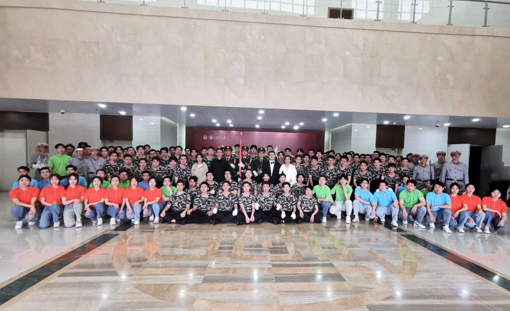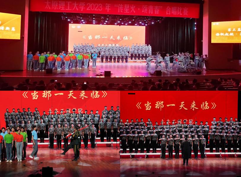 演出时,每一位同学都怀着激动的心情,期待而从容地登上了合唱舞台。灯光渐起,革命军人、国旗护卫队、时代青年映入眼帘。“回望峥嵘岁月,听黄钟大吕声声激荡;举目历史天空,看掠过军旗的道道霞光。”浑厚的朗诵声将人们带回了硝烟弥漫的战场,坚定刚毅的革命战士还原历史,直抵人心,国旗护卫队挺拔的身姿、有力的步伐全场瞩目,在将国旗交予青年后,音乐声起,同学们随着指挥澎湃高歌,迸发出了勇敢前进的青春正能量,合唱后,“土承天下,木撑苍穹;青春奋进,争创一流”的口号彰显了土木学子砥砺奋进,复兴有我的使命担当,将现场气氛推向高潮。