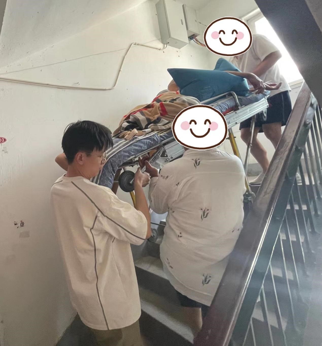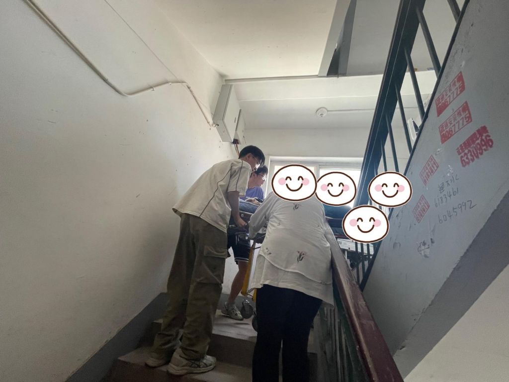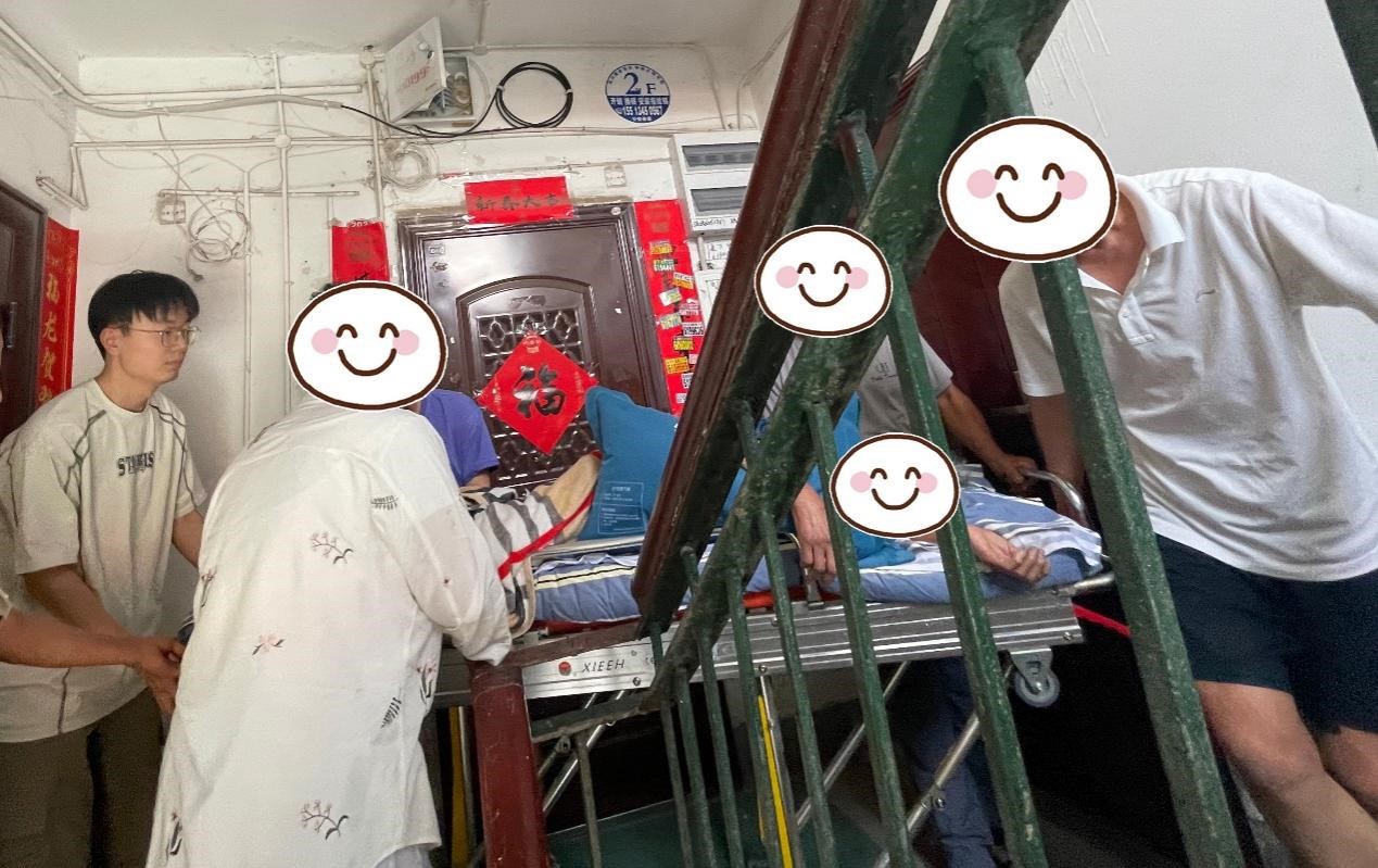 2024年6月13日中午11点半,土木第一研究生党支部书记柳丽接到一名MS88官方网站教职工的求助信息,对方称其居住在MS88官方网站西院住宅小区无电梯的住宅楼4楼,其家属中午12点将从医院治疗出院归来,但由于行动不便依旧卧于担架车上,而其他男性亲友有事无法前来,该名教职工及女性家属将出院家属抬上楼存在困难,所以希望能得到志愿者的帮助。柳丽同志在了解具体情况后,随即号召支部张鹏昆、曹培格、岳中华、张凯4名党员,积极承担抬担架助群众回家的“伸出援手,照亮他人”志愿服务,大家没来得及吃午饭便前往MS88官方网站西院住宅小区进行帮忙。