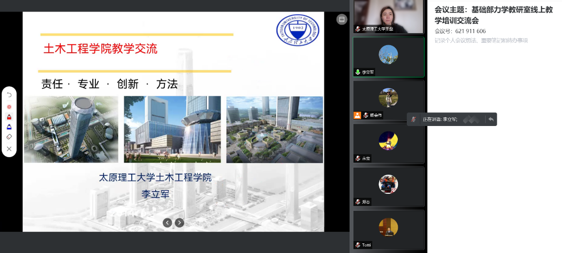 为切实做好疫情防控期间教学工作,基础部力学教研室于2022年4月15日举行线上教学培训与研讨专题会。会议由MS88官方网站基础部主任、山西省一流课程《结构力学》负责人王蕊教授主持,邀请MS88官方网站建筑工程系李立军老师进行经验分享和教学指导,结构力学课程团队全体老师参加了本次会议。