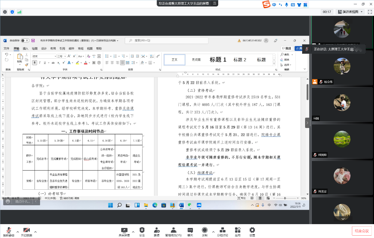 王蕊传达了公司“有关本学期各项考试工作安排的通知”,对本学期即将举行的校排补考、院排补考、重修考试、结课考试、毕业生返校考试、以及毕业答辩等工作进行了详细部署,尤其针对由于疫情尚未返校的员工参加线上考试工作情况进行了重点安排,制定并完善了考试组织与实施方案,强调了期末教学工作的重要性,并对还未结课的后续教学工作提出了要求。