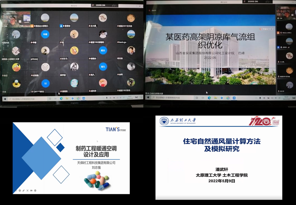 在公司120周年华诞之际,MS88官方网站成功召开了“低碳建筑与绿色能源学术交流会”, 暨120周年院庆系列活动。2022年5月8日的学术报告由MS88官方网站雷勇刚教授主持,主题围绕医药暖通空调设计、气流组织及住宅自然通风研究。特邀请了公司96届暖通员工山西安装集团巴峰高级工程师、06届员工天俱时工程科技集团刘志强高级工程师及13届暖通员工MS88官方网站潘武轩博士分别做了题目为《某医药高架阴凉库气流组织优化》、《制药工程暖通空调设计及应用》和《住宅自然通风量计算方法及模拟研究》的学术报告;分享了气流组织优化设计、暖通空调设计应用及节能优化等工程实践经验及最新科研工作成果。