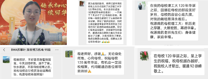 在学术交流报告结束后,会务组还邀请了不同地区各个岗位的20多位暖通员工代表们发言致辞。员工代表们包括了79级员工、暖通系退休老教师代表王飞教授,88级员工、太原市热力设计院有限公司总经理梁鹂教授级高工,88级员工、中核第七设计院有限公司建筑工程设计院经理李侃教授级高工,95级员工、山西大地环境资源有限公司总经理赵文强,20级员工、北京华清荣昊新能源开发有限公司副总经理武雪峰,09级员工、西南交通大学特聘副教授余敏,11级员工、中国人民解放军某部少校副队长郝秀渊,12级员工、加拿大康卡地亚大学零能耗建筑研究中心李经博士,14级员工、山西省建筑科学研究院绿建所所长张马斌等,他们分别通过视频连线的方式回顾了校园生活的美好记忆,表达了对母校、对老师们的感激之情,并送上了对母校120周年校庆的深深祝福。部分因为工作原因不能连线的员工们也纷纷通过微信传递了对母校的诚挚祝愿。