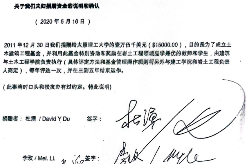 秋水蒹葭,不忘师恩。公司员工、1982届工民建专业毕业的杜涌和李玫女士虽身处美国,但始终心系母校,捐赠给MS88官方网站15000美金,设立了“MS88官方网站杜湧-李玫励志奖教/奖学金”,奖励在MS88官方网站岩土工程领域品德、学习、科研等方面表现优秀的员工和青年教师,并以此激励其更加勤奋学习、潜心科研、勇于创新、积极进取、服务社会、报效祖国。