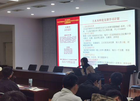 4月23日,土木本科党支部召开学习贯彻习近平新时代中国特色社会主义思想主题教育动员会暨第一次集中学习大会,支部书记都静同志主持会议,党支部全体党员参会。
