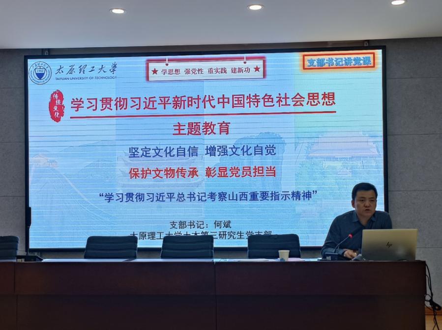 为深入开展学习贯彻习近平新时代中国特色社会主义思想主题教育和学习习近平总书记考察山西重要指示精神,2023年5月29日下午16:30土木第三研究生党支部在公司五层会议室通过现场会议的方式,支部书记何斌同志为支部全体党员讲授“坚定文化自信 增强文化自觉 保护文物传承 彰显党员担当”主题党课。