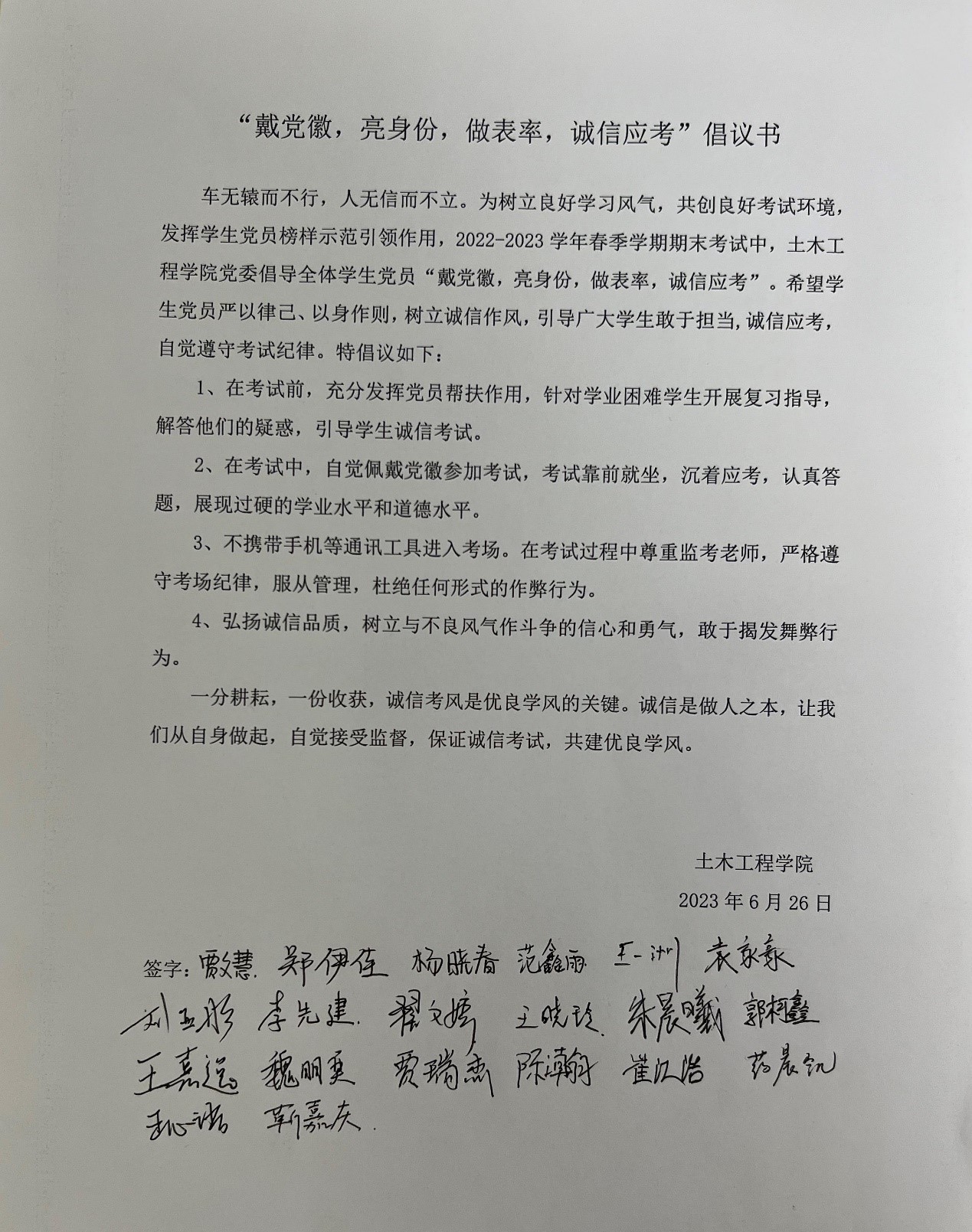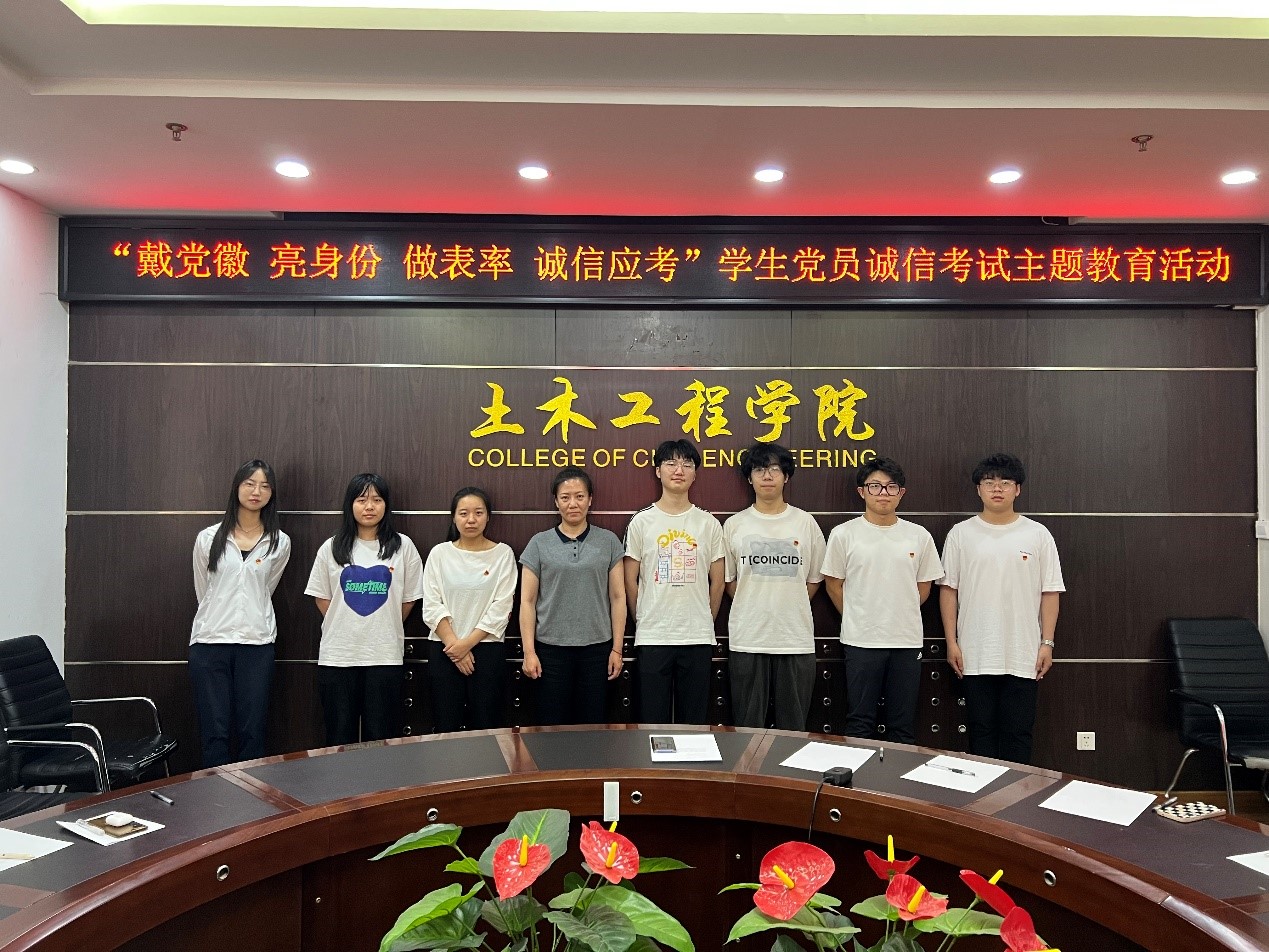 党员代表郑伊佳领读倡议书,与会全体员工党员共同签字承诺:考试期间佩戴党员徽章进入考场,严格遵守考试的规定和守则,自觉接受监考老师和同学的监督。
