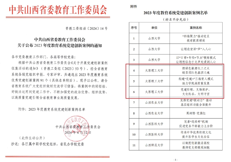 4月12日,中共山西省委教育工作委员会下发《中共山西省委教育工作委员会关于公布2023年度教育系统党建创新案例的通知》(晋教工委组函〔2024〕14号)。公司土木第三研究生党支部提交的《党建引领 文物保护 文化传承 文明守望》党建创新案例,成功入选山西省2023年度教育系统党建创新案例。