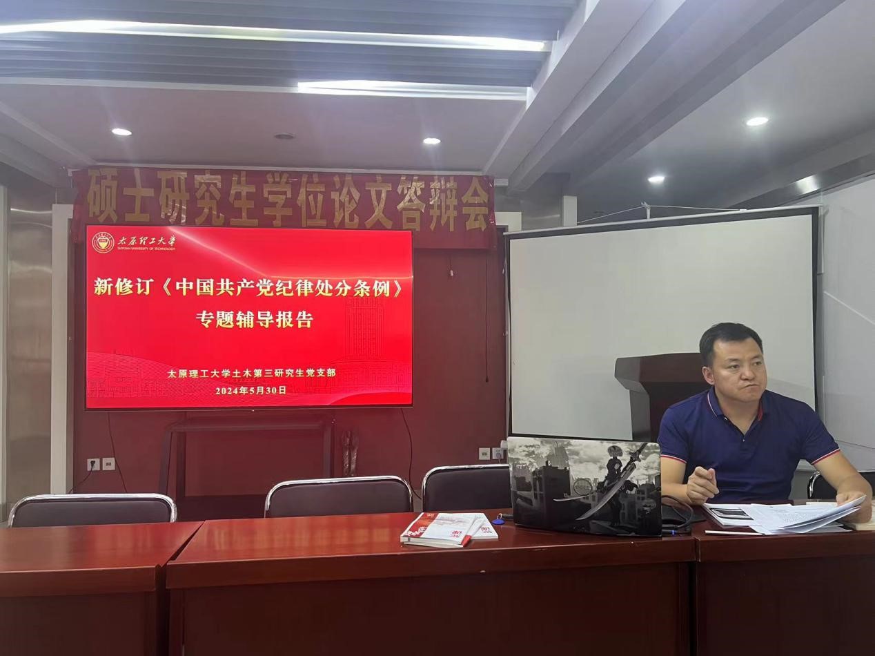 最后,何斌书记为进一步加强党纪学习对研究生党员进一步深入开展党纪学习教育提了三点要求。一是要在深化认识上下功夫,研究生党员要认真学习习近平总书记关于党纪学习教育的最新讲话要求,以更高标准学好用好党纪处分条例。二是要在笃学力行上下功夫,树标杆、做表率,把党纪学习教育进一步引向深入。三是要把开展党纪学习教育与土木第三研究生党支部“5321”工作模式紧密结合,与支部年度重点工作紧密结合,使党纪学习教育成为促进支部高质量发展的有效举措,确保党纪学习教育取得实效。